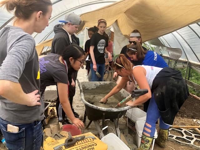 The month of May brought lots of flowers and even more volunteers. Early in the month, students from Park Hill High School came to the farm to do garden work. They also began creating cement tiles to add flooring to the greenhouse. Later during the month students fromWashington High stopped by the farm to continue the earlier work. The students finished the flooring and moved some bricks onto the farm to be used later. The students formed a human chain to make quick work of their tasks. It was a true team effort. CHWC is able to make the most out of amazing community assets like Splitlog Farm because of our strong volunteer base. Want to contribute to our living learning lab, help feed urban Kansas City, Kansas, and learn sustainable farming techniques along the way? Let us know you’d like to help!- May