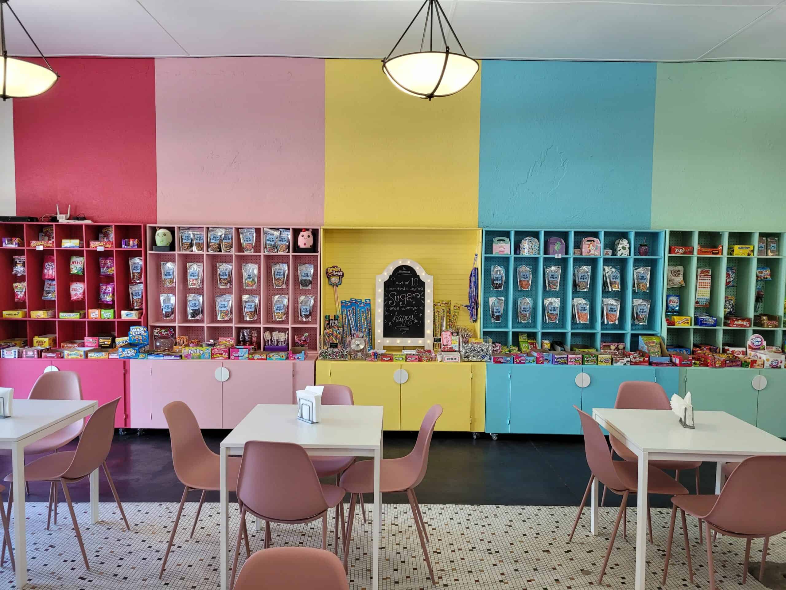 Hey Sugar offers unique candy, international candy, shave ice, ice cream, and more. The colorful storefront invites community members to come in and try their delicious treats or host a gathering in their community room.