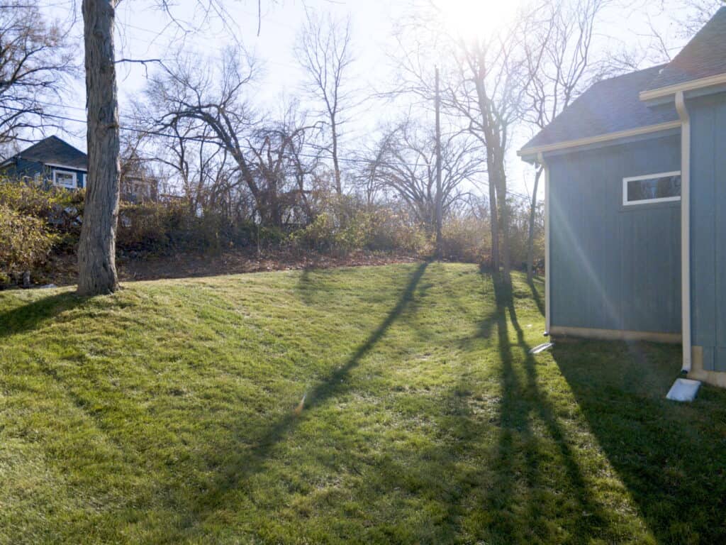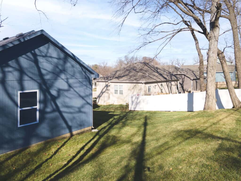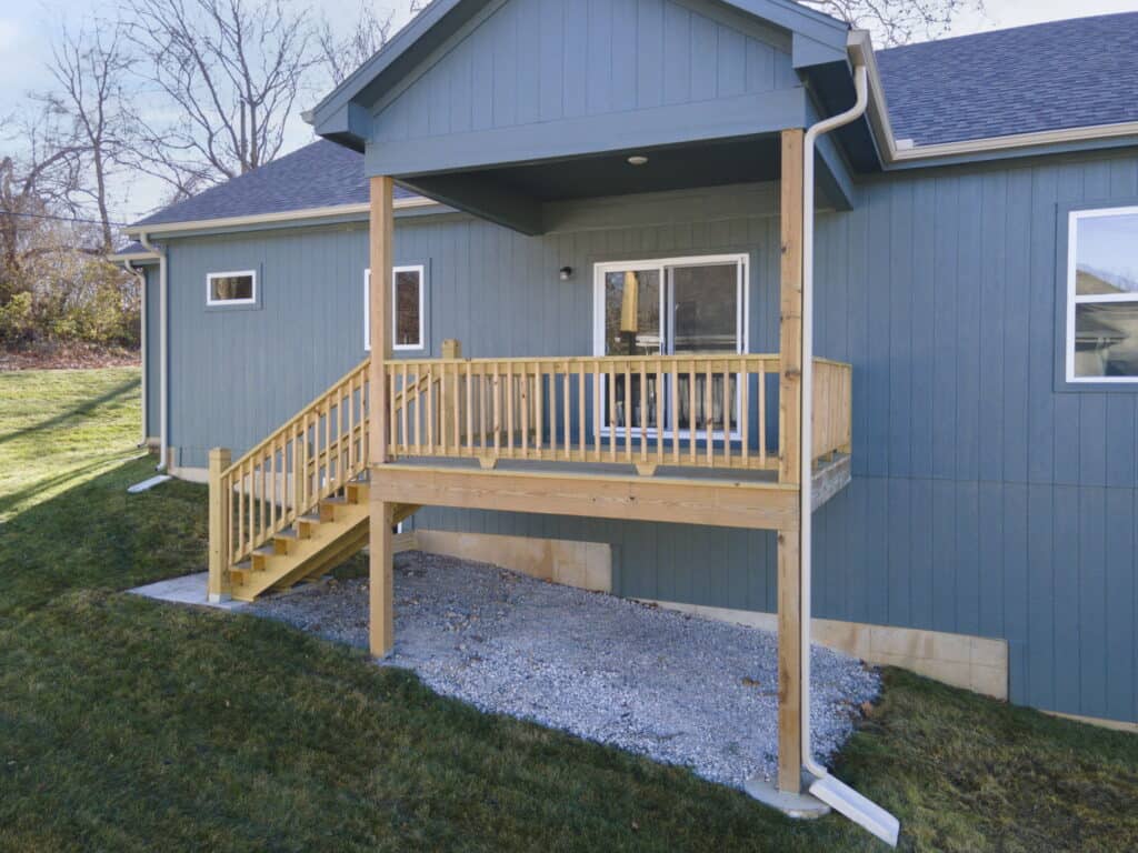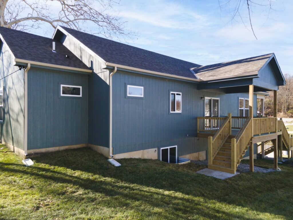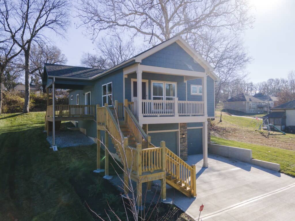 A photo of a blue two-story house with a drive-under garage, exterior front staircase, front porch, and white trim.